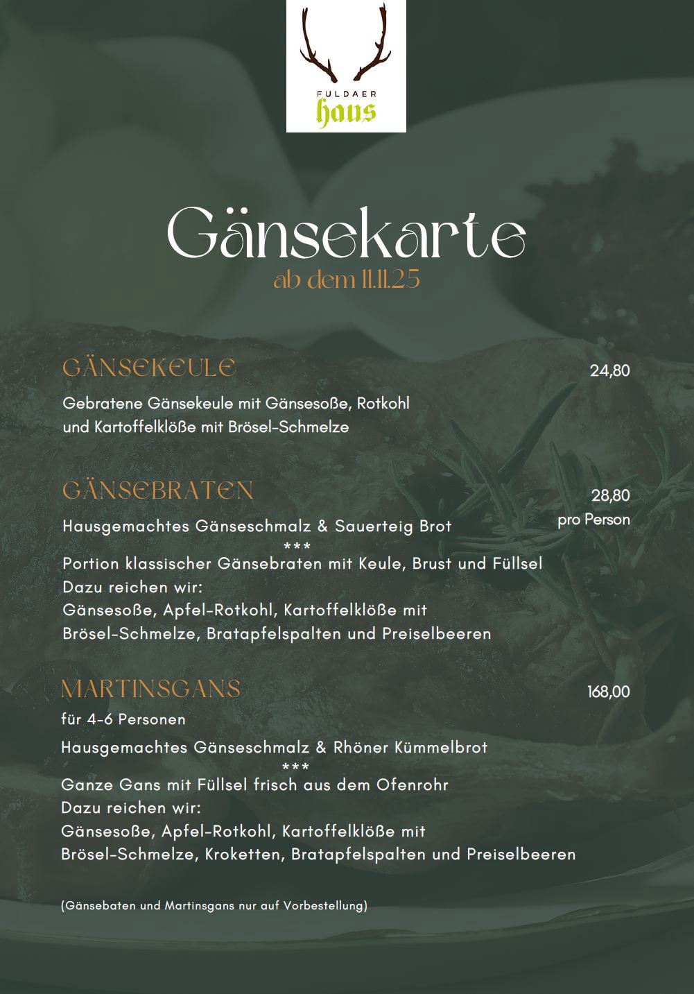 Bitte beachten Sie: Gänsebraten und Martinsgans nur auf Vorbestellung! Zu jeder ganzen Ganz gibt es eine Flasche Wein vom Haus gratis dazu!